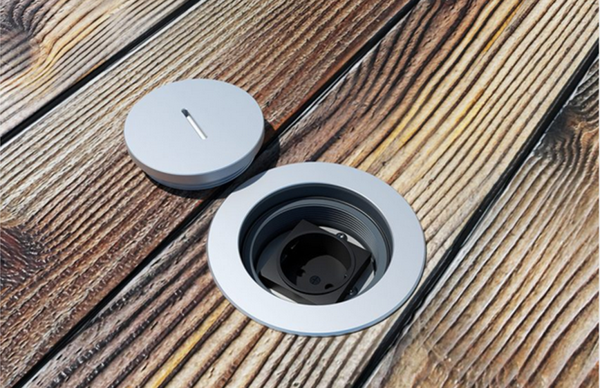 Podzemní zásuvka kulatá se šroubovacím víkem (pomocí klíče). Zabudovaná v úrovni podlahy, z šedého masivního PVC. Povrch víka z hliníku.
