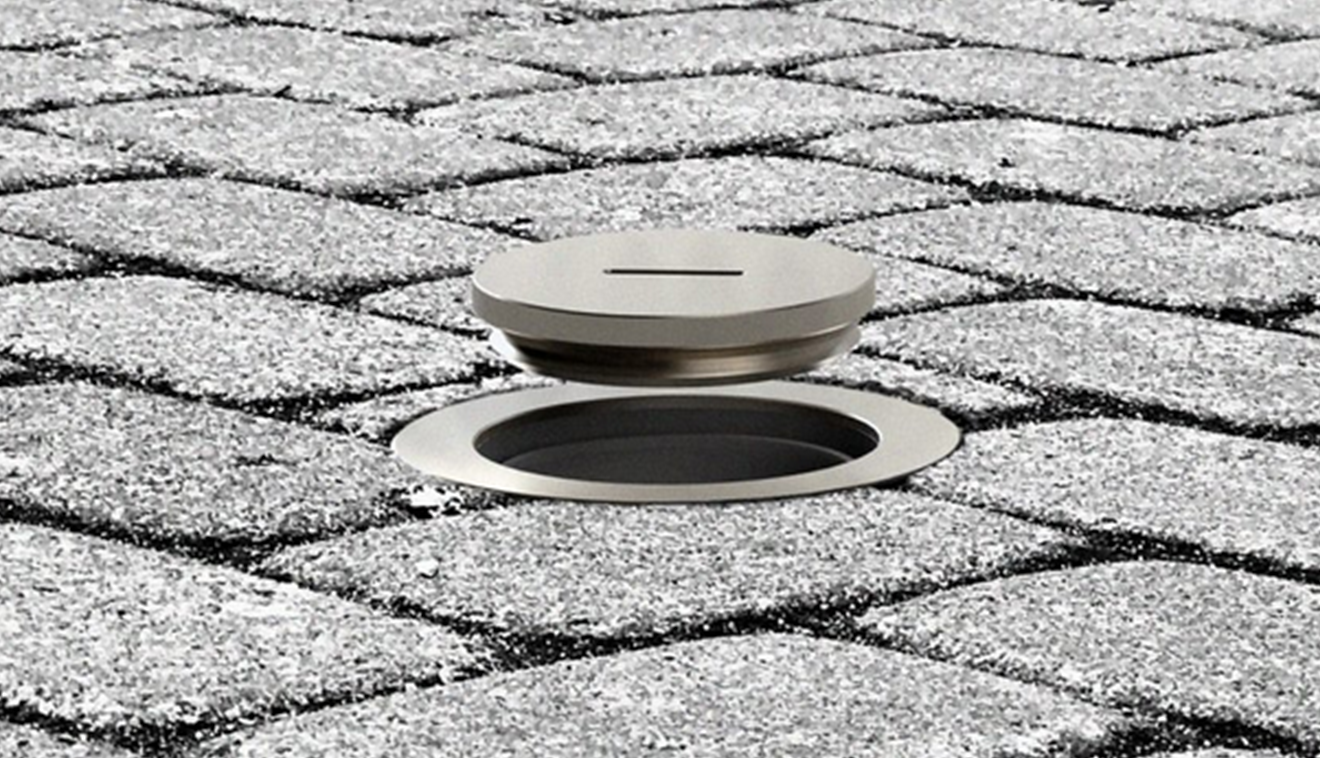 Podzemní zásuvka kulatá se šroubovacím víkem (pomocí klíče). Zabudovaná v úrovni podlahy, z masivní hliníku, víko také z hliníku se vzhledem ušlechtilé oceli, eloxovaný.